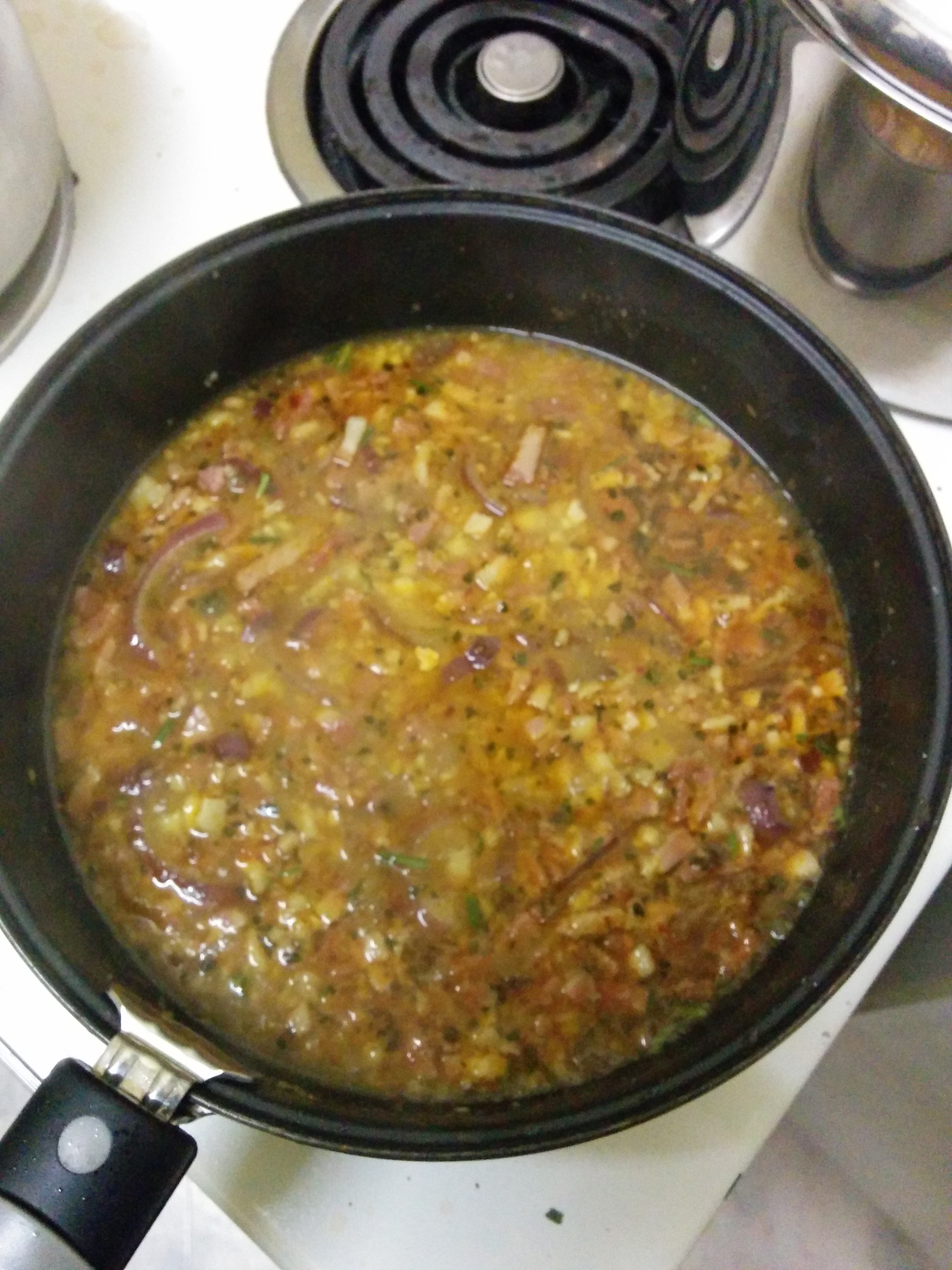 Meanwhile, in the deep frypan, turn the heat down and add sliced red onion, bacon, garlic, chilli, smoked paprika and finely chopped lemon thyme. Stirring, add the chopped chestnuts, stock powder and cup of water.