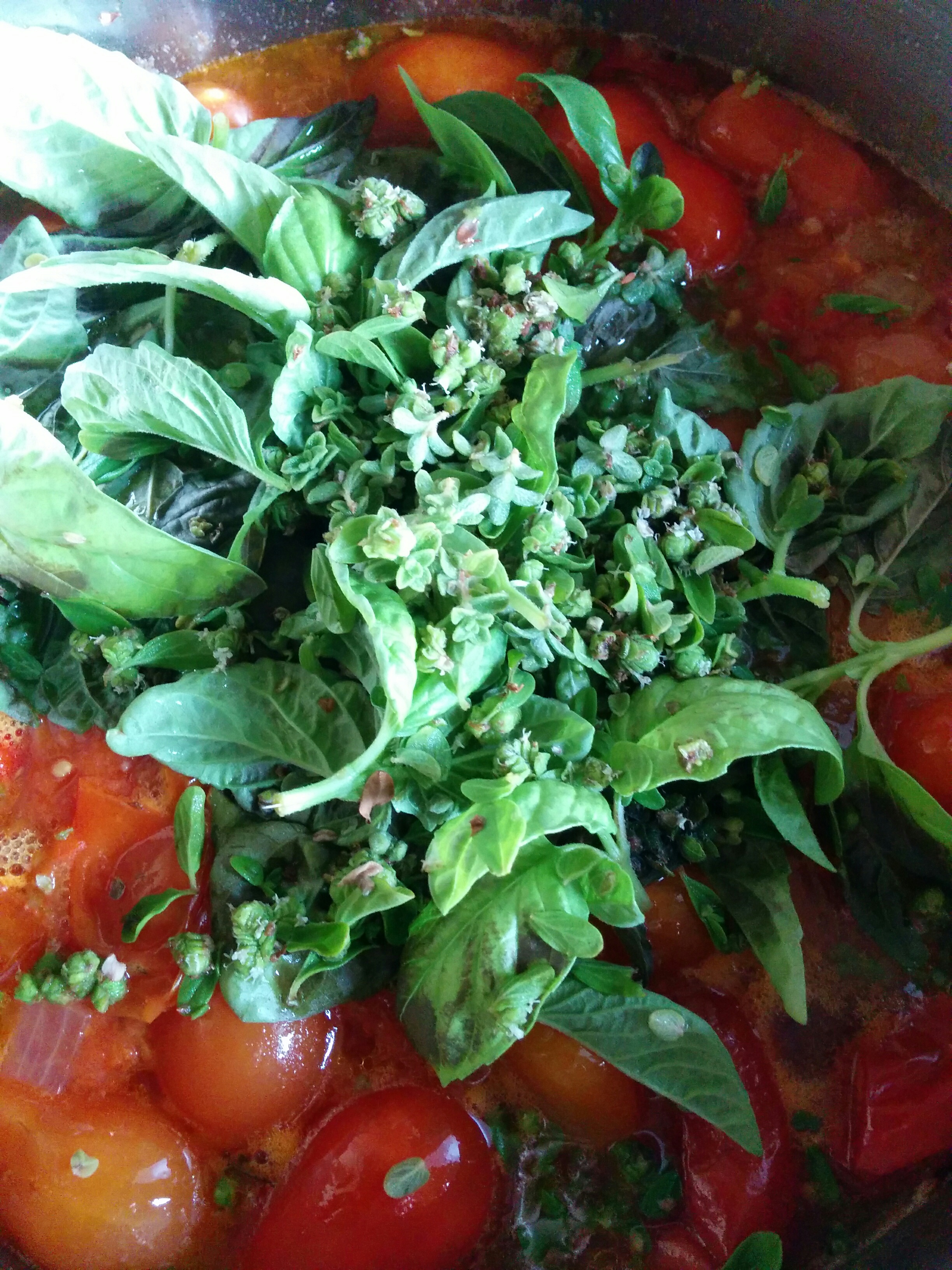Add the fresh herbs and continue cooking until it starts to look like a tomato soup. Season it to taste. Take off the heat, cover and leave overnight.