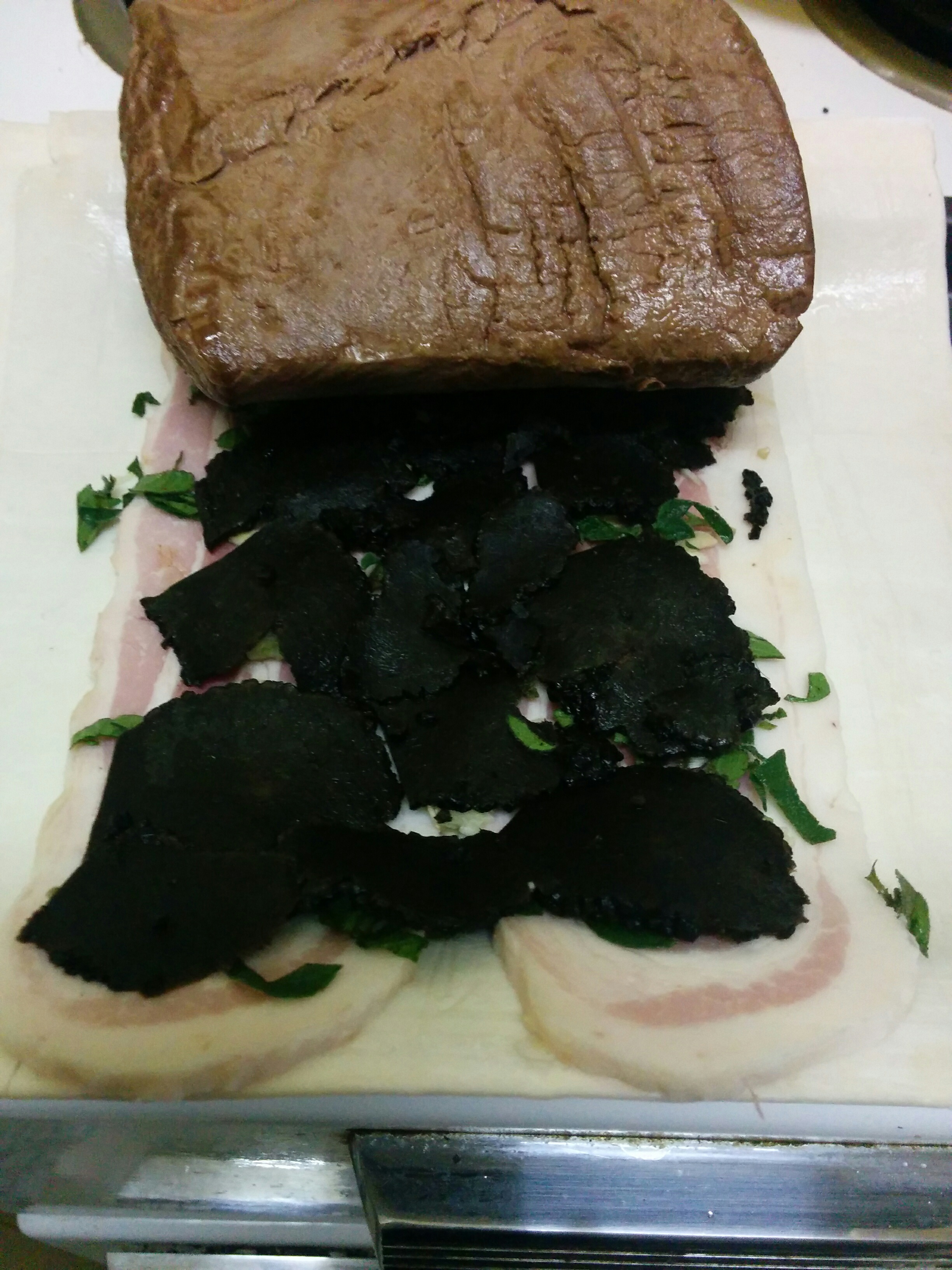 On a clean board remove the bacon rind, chop the garlic and herbs finely and slice the truffle. On a defrosted pastry sheet, lay out the rashers of bacon side by side and cover with the chopped herbs and shaved truffle. I don’t have a proper truffle shaver but find the slicing blade of a box grater does very well. Also, I don’t generally use salt and pepper but if you do, this would be the spot to use it.